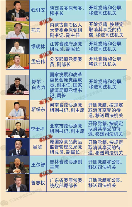 2019年全年,中央纪委国家监委网站公布了秦光荣、李谦、彭宇行等20名中管干部接受中央纪委国家监委审查调查消息,以及缪瑞林、孟宏伟、努尔·白克力等23人的党纪政务处分结果。